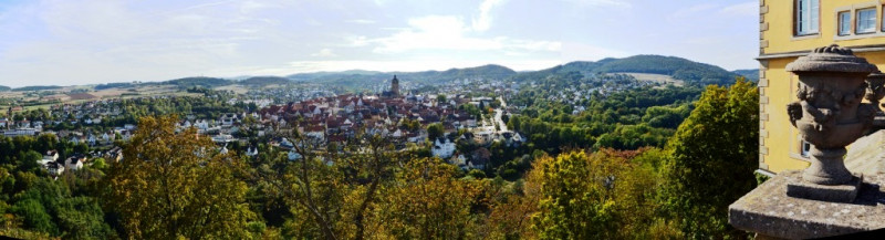 Bad Wildungen - widok z zamku na stare miasto. W tle zalesione wzgórza Kellerwaldu