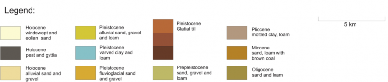 Na terenie badań utwory czwartorzędu zalegają bezpośrednio na osadach neogenu lub paleogenu. Silne zróżnicowanie ich miąższości od 0 do około 150 metrów, spowodowane jest m.in. deformacjami stropu pliocenu.