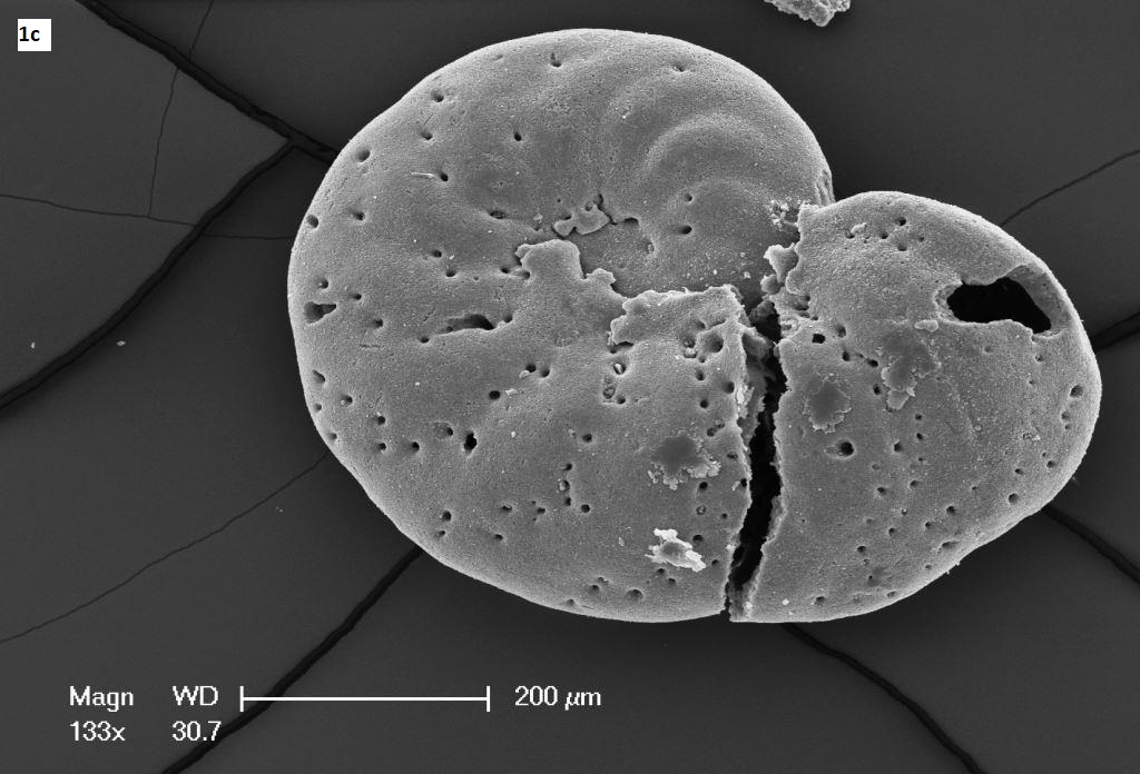 Skorupka kopalnej otwornicy (górna kreda, odsłonięcie Mielnik, Polska) zbudowana z węglanu wapnia (kalcyt); zdjęcie wykonano przy użyciu mikroskopu skaningowego
