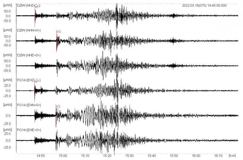 Obraz falowy z zapisem rejestracji trzęsienia ziemi o magnitudzie M7.3 z epicentrum w regionie Near East Coast of Honshu z 16.03.2022 r., godz. 14:36:32.4 (UTC) zarejestrowane przez szerokopasmowe stacje sejsmologiczne PSG zlokalizowane w laboratoriach geodynamicznych w Hołownie (PG14) i w Dziwiu (DZIW). Na wykresie składowej zaznaczono pierwsze wstąpienia fali sejsmicznej P i S.