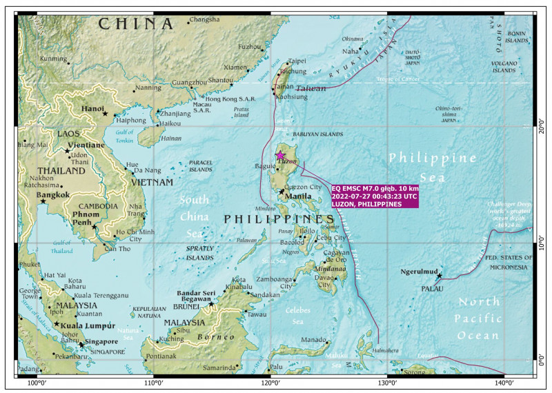 Lokalizacja epicentrum trzęsienia ziemi o magnitudzie M7.0 z 27 lipca 2022 r., godz. 00:43:23.9 UTC w regionie sejsmologicznym Luzon, Filipiny (oprac. PSG, mapa bazowa: CIA).