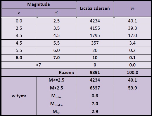 Statystyka wstrząsów sejsmicznych zarejestrowanych na obszarze Polski oraz w strefie przygranicznej w marcu 2023 r. w sieci monitoringu PSG. Na ogólną liczbę 36 zdarzeń sejsmicznych zarejestrowanych w sieci PSG_Sejs_NET w okresie od 1 do 31 marca 2023 r. na obszarze Polski oraz w strefie przygranicznej w tabeli pominięto 21 zdarzeń o magnitudzie M<+ 2,5 (poniżej progu odczuwalności)
