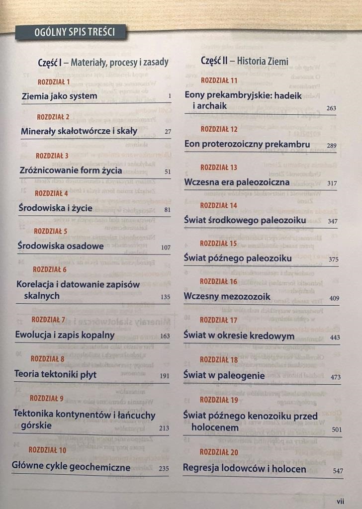 Książka jest ułożona w logiczny sposób, który ułatwia poznawanie kolejnych zagadnień w zsyntetyzowany sposób. Pierwsze dziesięć rozdziałów zostało poświęconych podstawom różnych zagadnień geologicznych, poczynając od budowy litosfery, poprzez mineralogię, sedymentologię, paleontologię i tektonikę, ze szczególnym uwzględnieniem tektoniki płyt. Są w niej także przedstawione główne cykle geochemiczne oraz metody datowania skał.