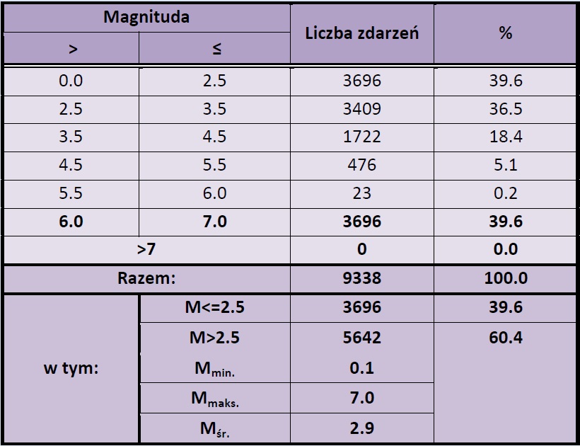 Na obszarze kontynentu europejskiego i obszarach przyległych w listopadzie 2023 r. w bazie danych EMSC zarejestrowano 3 615 zdarzeń sejsmicznych o magnitudzie od M=0.1 do M=5.3. Charakterystykę europejskiej aktywności sejsmicznej przedstawiono w tabeli 5 (statystyka wstrząsów). Spośród wszystkich zarejestrowanych zjawisk – 2 580 (71,4 %) osiągnęło magnitudę poniżej poziomu odczuwalności przez człowieka, tj. M<=2.5, próg ten przekroczyło 1 035 zjawisk, co stanowi 28,6% ogólnej ich liczby.