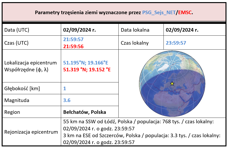 Parametry zjawiska sejsmicznego z dnia 02/09/2024 r. o godz. 21:59:57 (UTC), region: Bełchatów, Polska