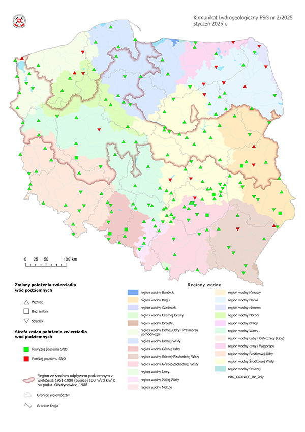 W styczniu 2025 roku na większości obszaru Polski odnotowano wyższy poziom zwierciadła wód podziemnych w pierwszym poziomie wodonośnym w porównaniu ze stanem z grudnia 2024 r. Punkty, w których odnotowano wzrost średniego poziomu wód podziemnych stanowiły ponad 65% wszystkich analizowanych punktów obserwacyjnych. W około 31% punktów obserwacyjnych średni miesięczny poziom wód podziemnych obniżył się, ale nadal w większości tych punktów pozostawał powyżej granicy stanu niskiego ostrzegawczego (SNO). Niewielkie spadki poziomu wody, przeważnie nieprzekraczające 0,1 m, wystąpiły głównie w południowej i wschodniej części kraju. W przypadku ponad 4% punktów obserwacyjnych poziom wód podziemnych pozostał bez zmian w odniesieniu do stanu z poprzedniego miesiąca.