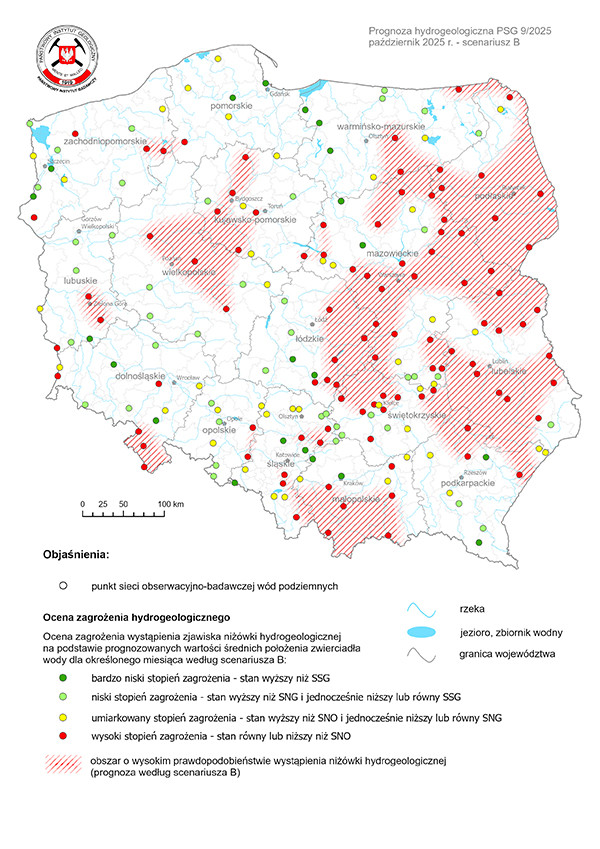 Według scenariusza B, zakładającego deficyt opadów atmosferycznych w najbliższych tygodniach. Według tego wariantu w okresie od 1 do 31 października 2025 r. prognozuje się wystąpienie niżówki hydrogeologicznej w skali regionalnej w obrębie województw: podlaskiego, warmińsko-mazurskiego, mazowieckiego, lubelskiego, małopolskiego, a także, w mniejszym stopniu, w województwach: zachodniopomorskim, wielkopolskim, kujawsko-pomorskim, łódzkim, świętokrzyskim, podkarpackim, dolnośląskim, śląskim i lubuskim.