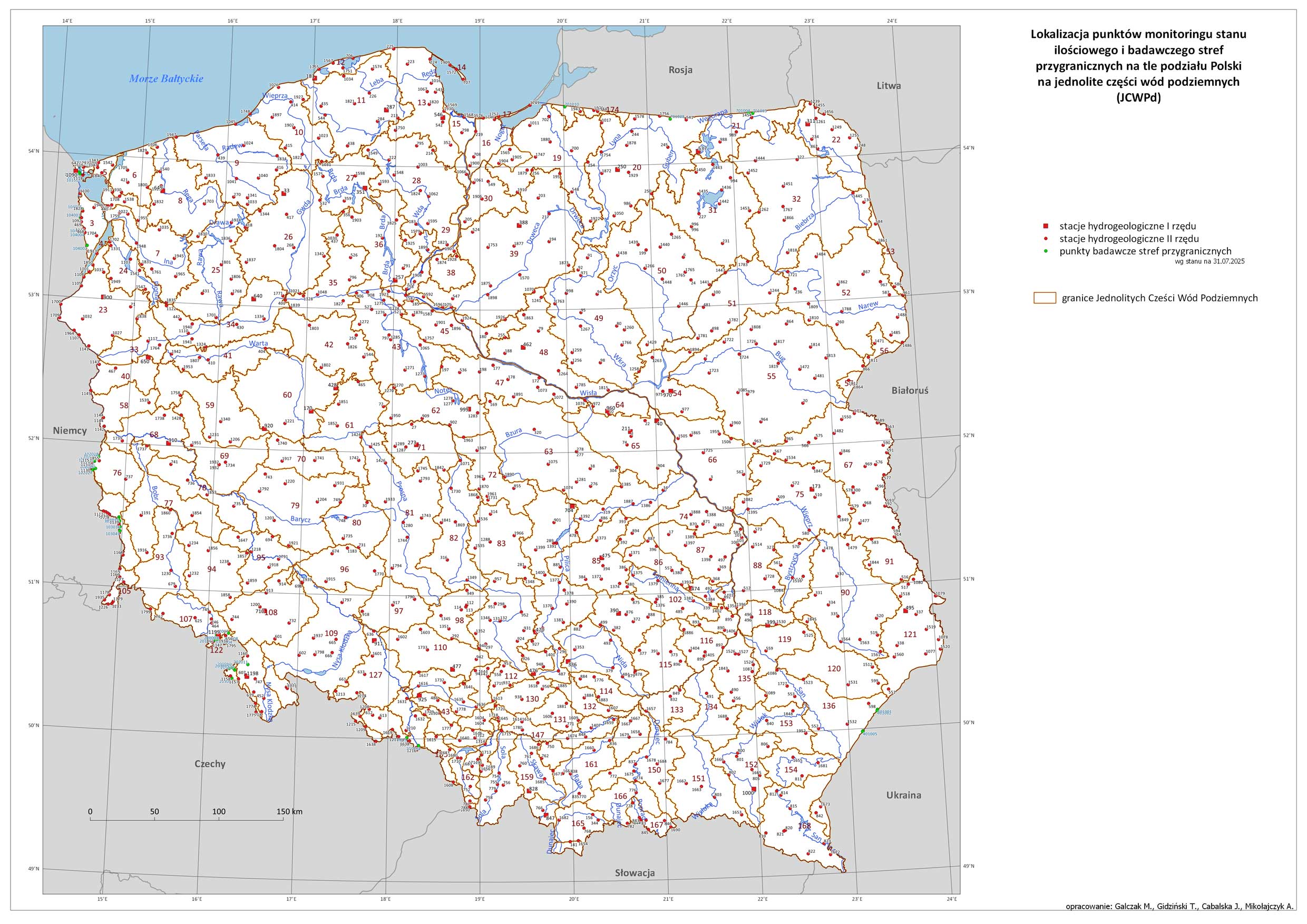 Ryc. 3. Lokalizacja punktów monitoringu stanu ilościowego – stacji hydrogeologicznych sieci obserwacyjno-badawczej wód podziemnych PIG-PIB na tle podziału Polski na jednolite części wód podziemnych (JCWPd) – podział na 174 jednolitych części