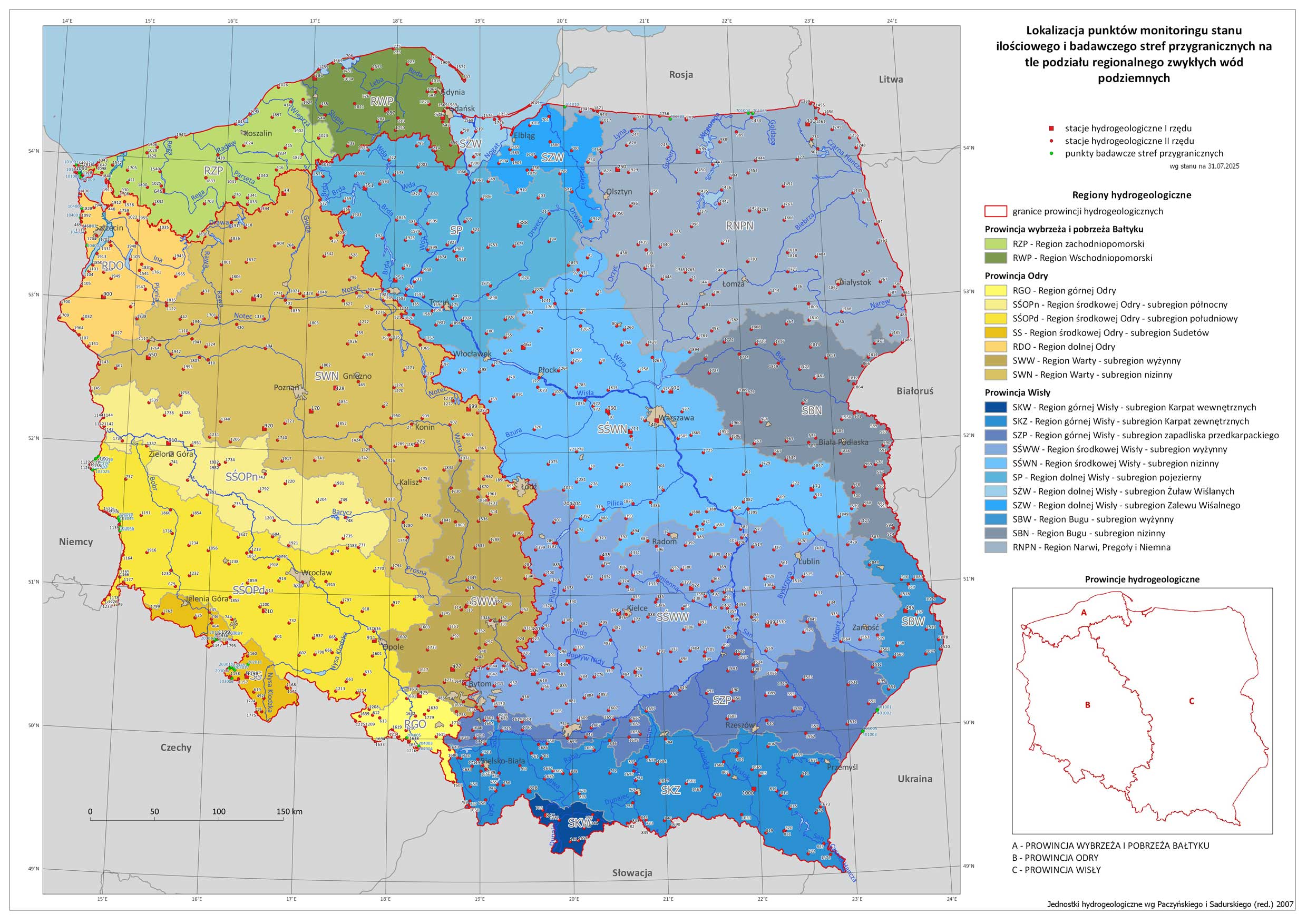 Nowa rejonizacja hydrogeologiczna Polski została opracowana w 2007 roku przez PIG-PIB w nawiązaniu do dorzeczy Wisły i Odry wraz z głównymi dopływami tych rzek.