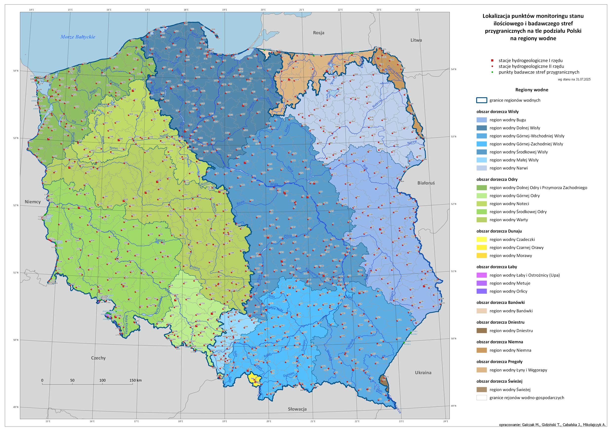 Ryc. 2. Lokalizacja punktów monitoringu stanu ilościowego – stacji hydrogeologicznych sieci obserwacyjno-badawczej wód podziemnych PIG-PIB na tle podziału Polski na regiony wodne