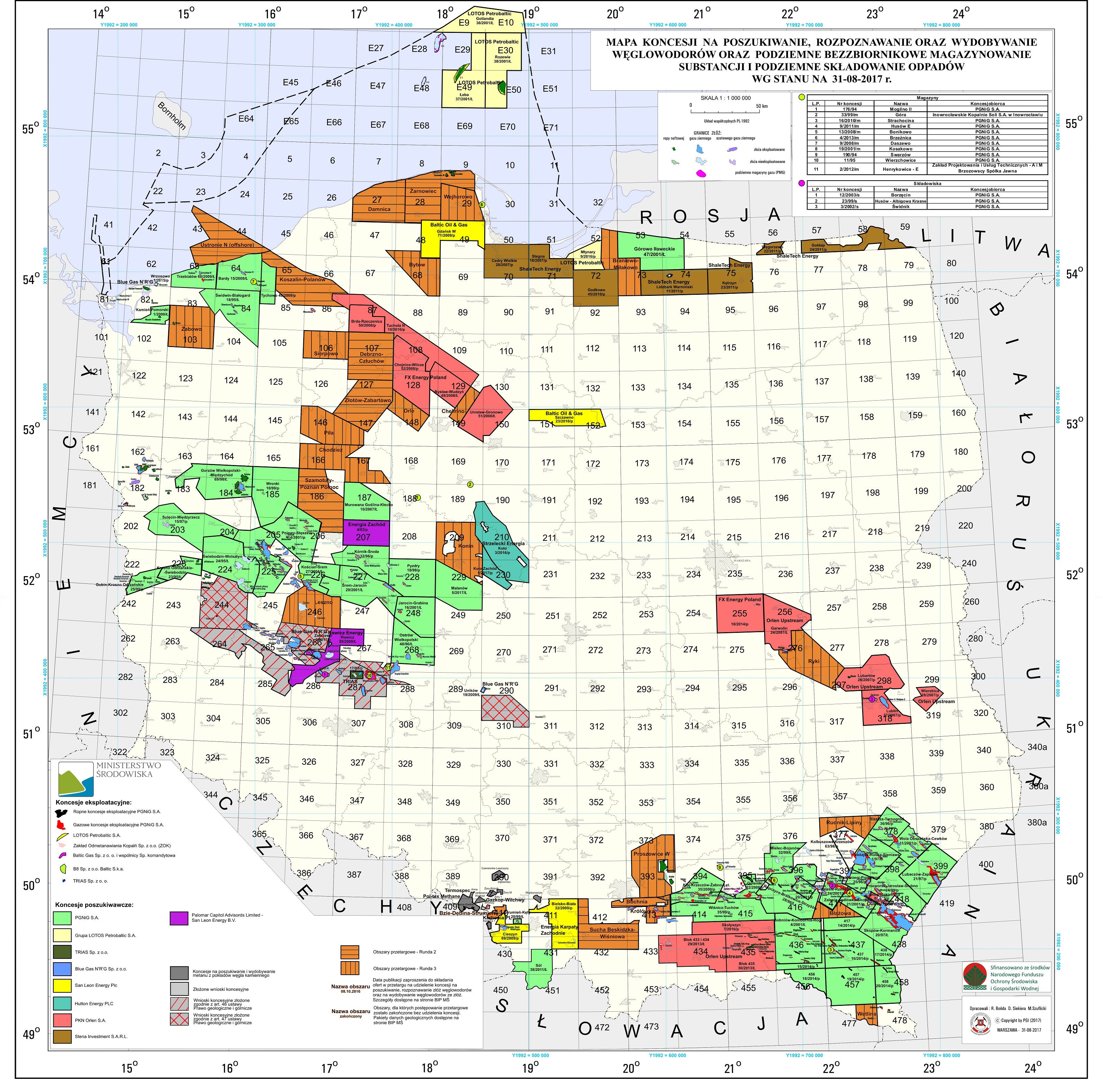Mapa koncesji na poszukiwanie, rozpoznawanie oraz wydobywanie węglowodorów oraz podziemne bezzbiornikowe magazynowanie substancji i podziemne składowanie odpadów według stanu na dzień 31.08.2017 r.