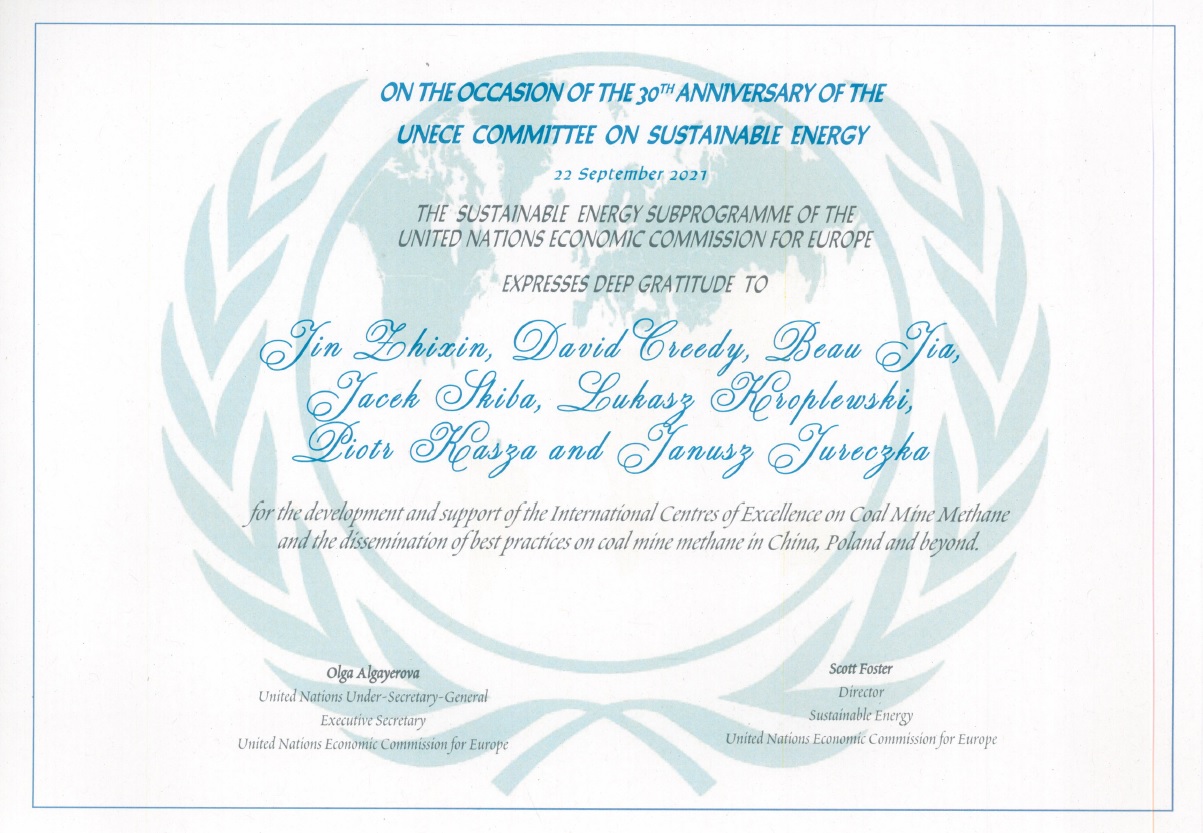 The 30th Anniversary Session of the Committee on Sustainable Energy of the United Nations Economic Commission for Europe (UNECE) was held in Geneva from 22 to 24 September 2021. During the session, UNECE Executive Secretary Ms. Olga Algayerova honored a group of experts from Poland and China for their outstanding work on behalf of the Committee and the International Mine Methane Centers of Excellence.