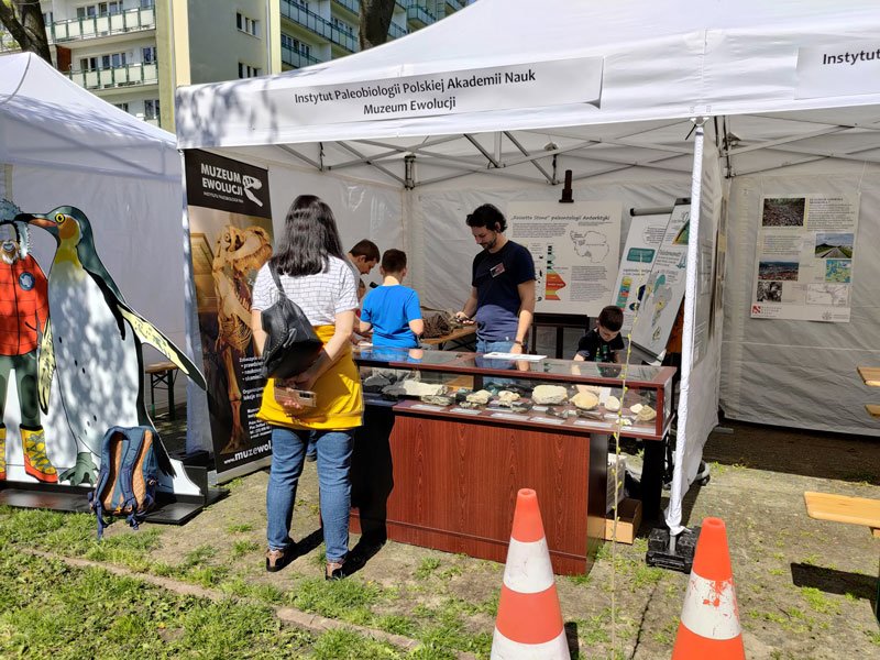 Punktualnie o godz. 10.00 przy bramie do Muzeum Geologicznego pojawili się pierwsi goście. Spieszyli się, bo i atrakcji było dużo. Od wejścia zwiedzających witały stoiska edukacyjne. Instytut Paleobiologii Polskiej Akademii Nauk, w tym Muzeum Ewolucji, zaprezentował paleontologiczne odkrycia polskich polarników. Na stoisku Wydziału Archeologii Uniwersytetu Warszawskiego i Państwowego Muzeum Archeologicznego w Warszawie obejrzeć można było narzędzia krzemienne z epoki kamienia i przyjrzeć się sposobowi ich wytwarzania. Z kolei sposób pozyskiwania i obróbki żelaza w jednym z największych u schyłku starożytności ośrodków hutnictwa żelaza na terenach tzw. barbarzyńskiej Europy zaprezentowało Muzeum Starożytnego Hutnictwa Mazowieckiego im. Stefana Woydy w Pruszkowie. Na stoisku Wydziałów Geografii i Neofilologii UW można było podyskutować na temat zagadnień rabunkowej eksploatacji surowców mineralnych i zasobów przyrodniczych Ameryki Środkowej, w tym flory i fauny. Muzeum Geologiczne zaprezentowało stanowiska minerałów, skał i skamieniałości, gdzie każdy mógł dotknąć, porównać ciężar, fakturę i inne właściwości fizyczne okazów i nauczyć się odróżniać np. amonit od trylobita lub ślimaka. Chcący sprawdzić swoją wiedzę lub ją rozszerzyć poprzez zabawę brali udział w konkursach geologicznych, paleontologicznych i geograficznych na stoisku muzealnym, a także w grze muzealnej przygotowanej przez Stowarzyszenie Geocaching Warszawa. O geocachingu wszystkiego można było się dowiedzieć na stoisku stowarzyszenia. Oczywiście nie mogło zabraknąć atrakcji dla dzieci. Muzeum Geologiczne przygotowało wykopaliska paleontologiczne, a Regionalna Dyrekcja Lasów Państwowych – Leśne Miasteczko z licznymi edukacyjnymi zabawami drewnem.