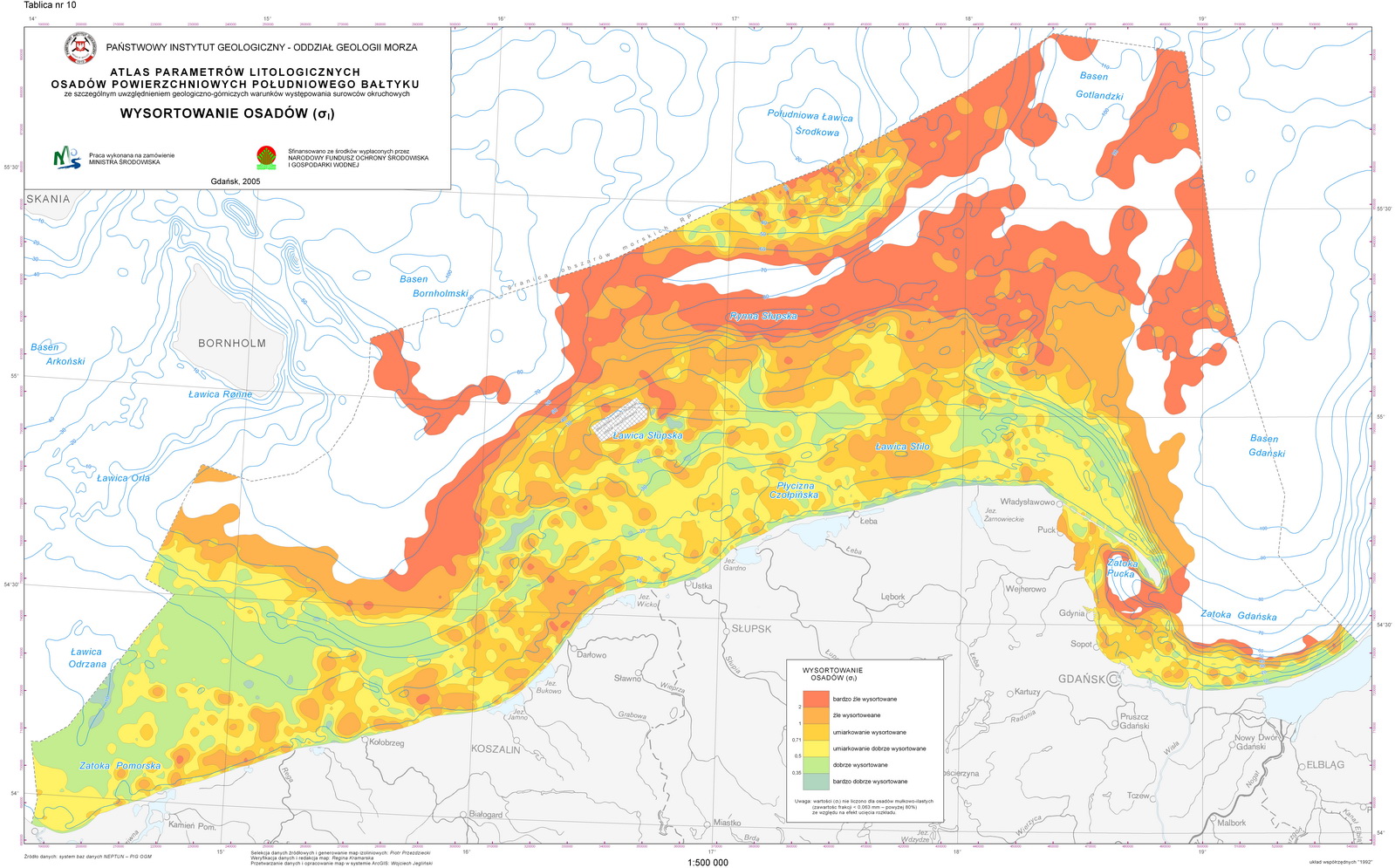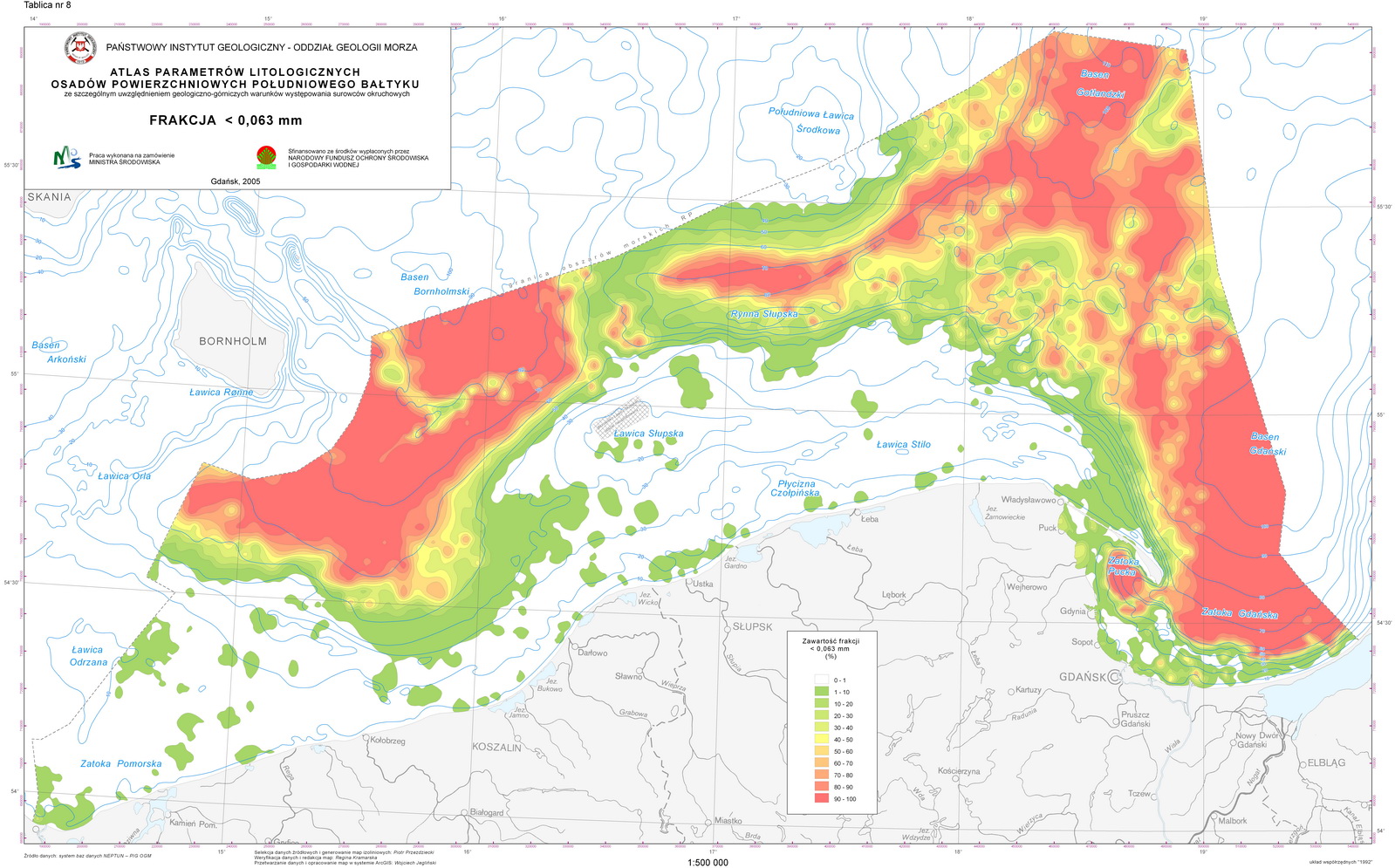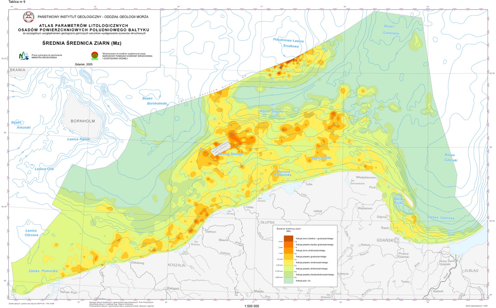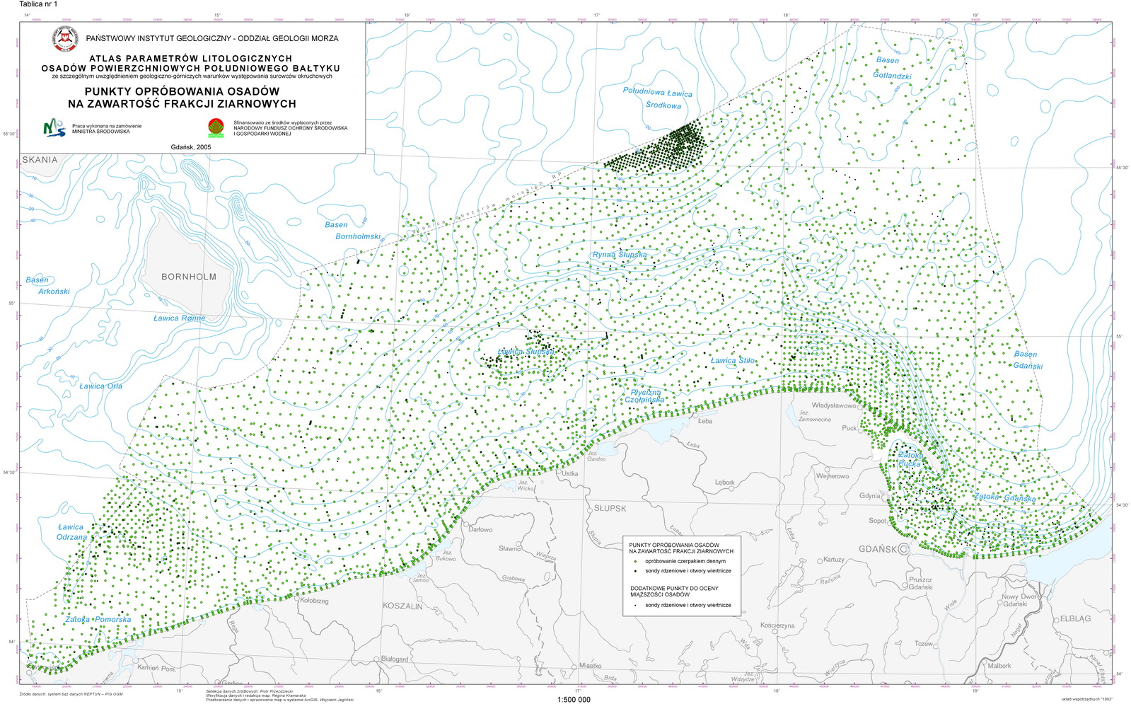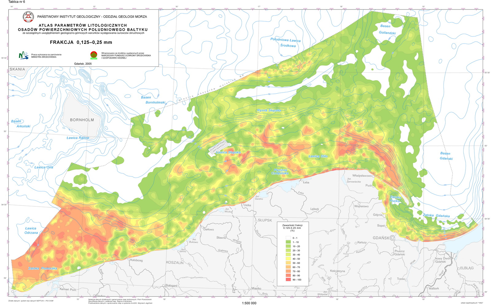 Pełen tytuł opracowania brzmi: Atlas parametrów litologicznych osadów powierzchniowych południowego Bałtyku ze szczególnym uwzględnieniem geologiczno-górniczych warunków występowania surowców okruchowych