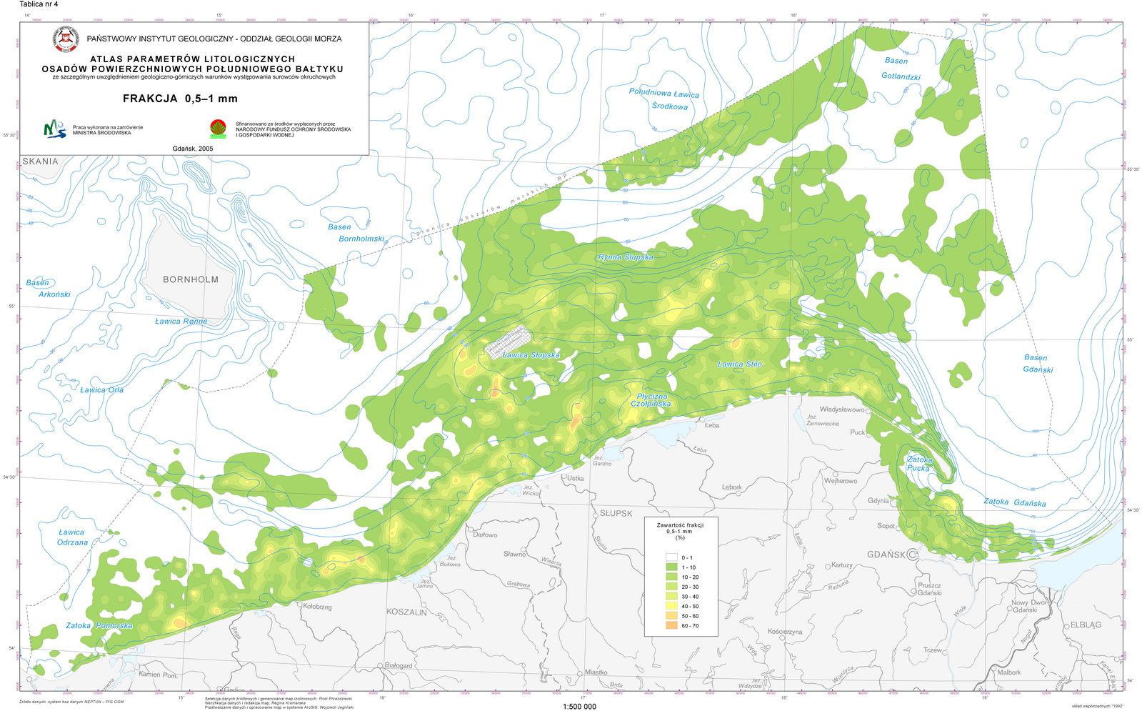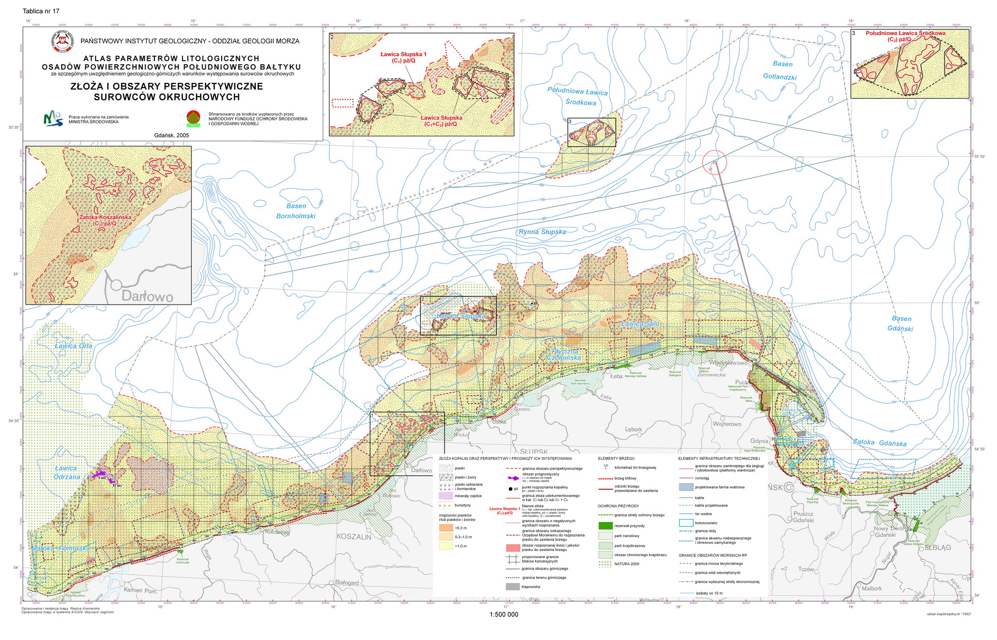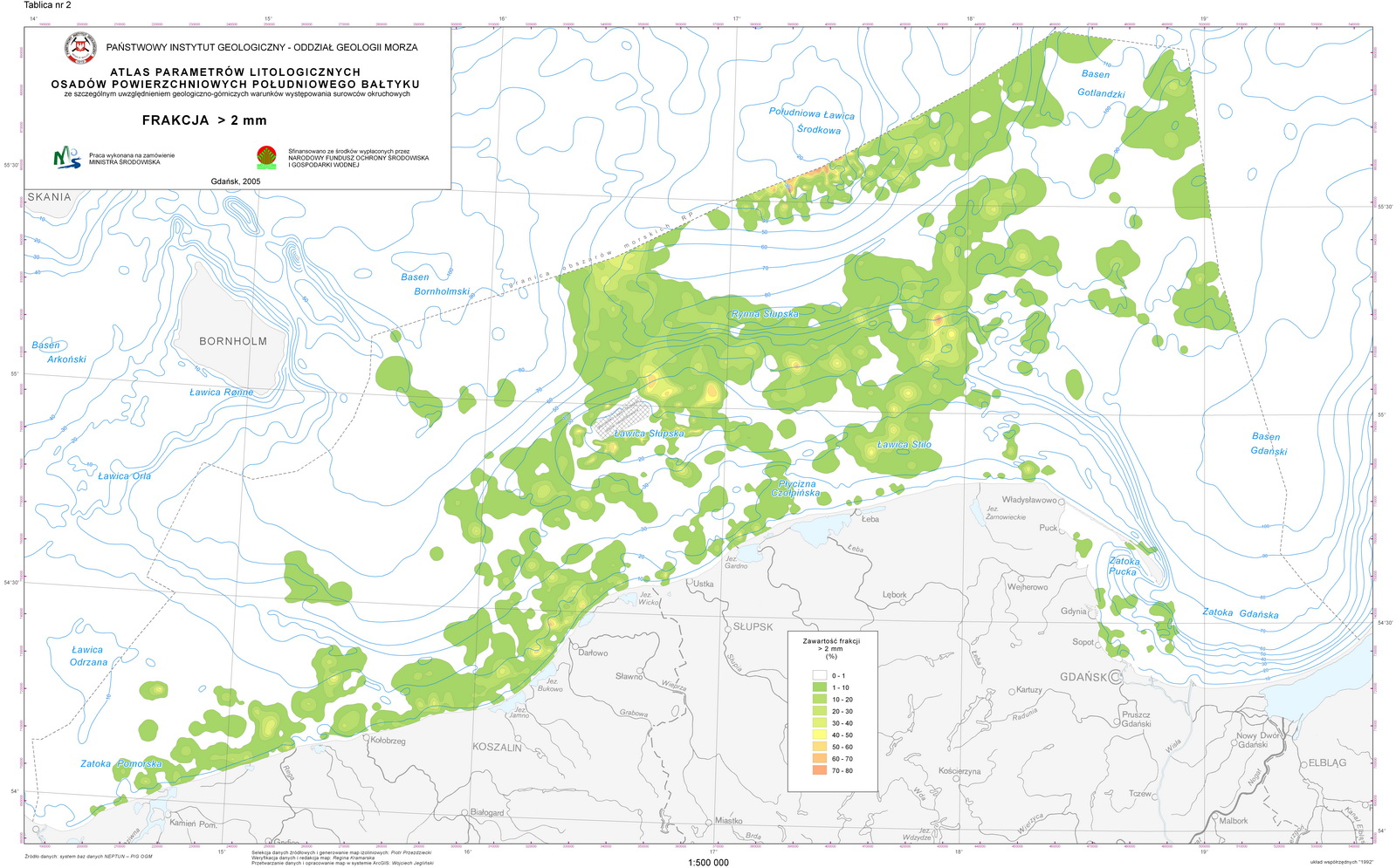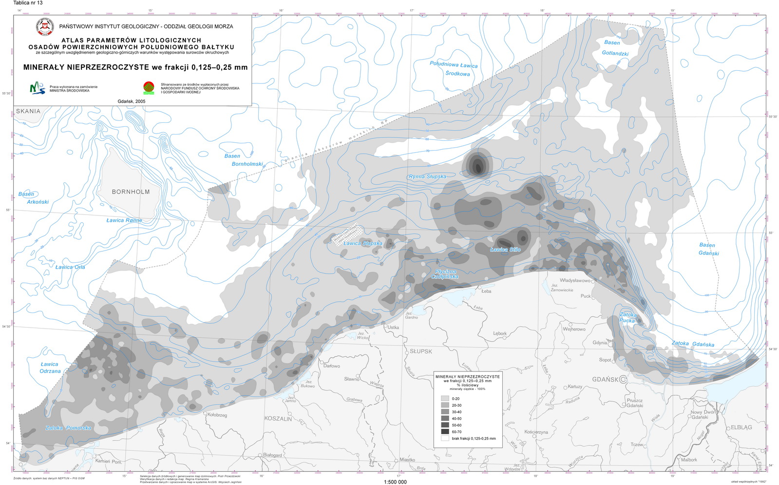 Pełen tytuł opracowania brzmi: Atlas parametrów litologicznych osadów powierzchniowych południowego Bałtyku ze szczególnym uwzględnieniem geologiczno-górniczych warunków występowania surowców okruchowych