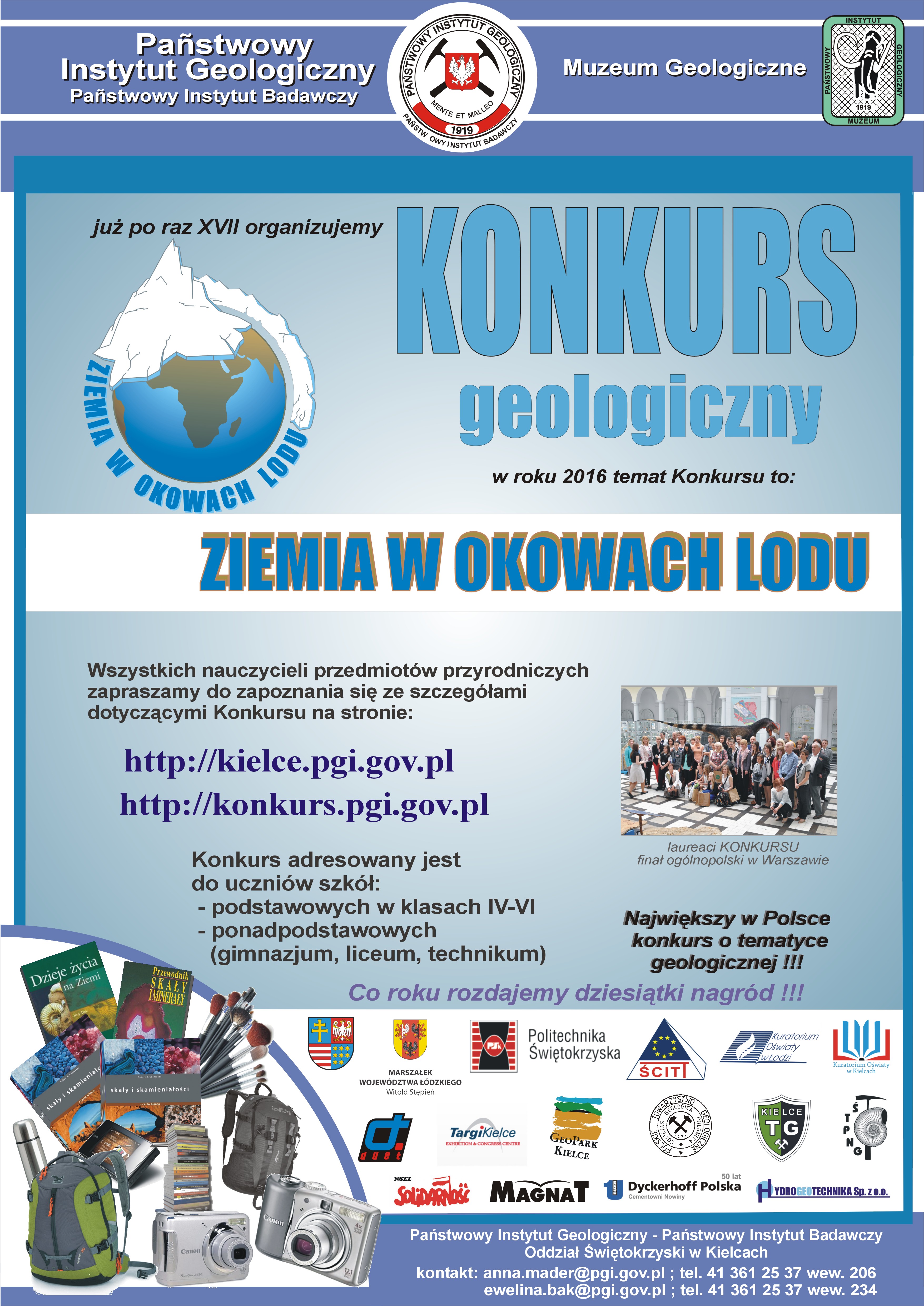 W tym roku nasz Konkurs geologiczno-środowiskowy "Nasza Ziemia - środowisko przyrodnicze wczoraj, dziś i jutro ..." odbywa się pod hasłem "Ziemia w okowach lodu". Zapraszamy do zapoznania się z załączonymi komunikatami konkursowymi. Mamy nadzieję, że tematyka Konkursu zainspiruje Was i zachęci do wzięcia w nim udziału. Na Wasze prace czekamy do 1 kwietnia 2016 r.