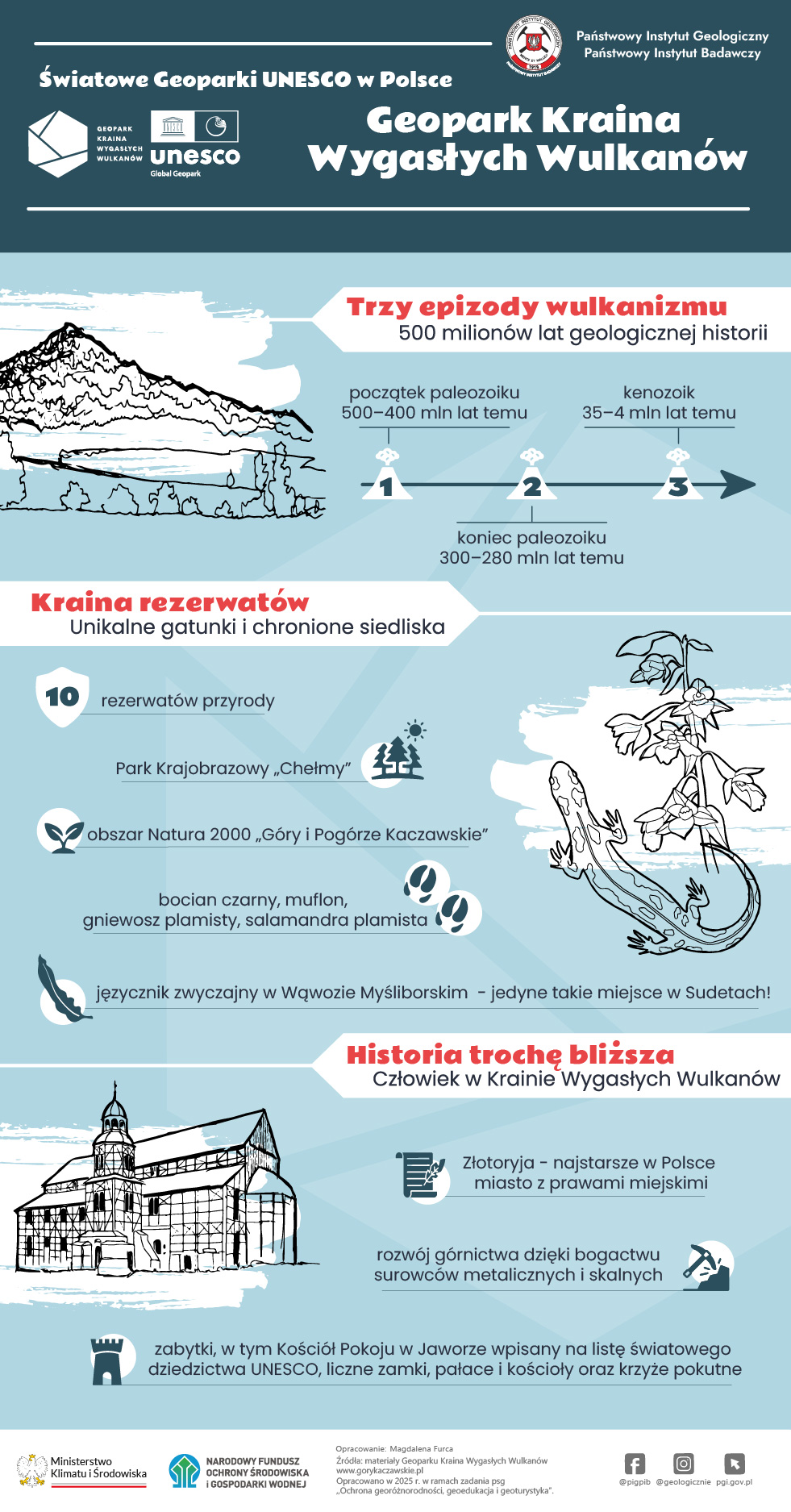 W sercu Gór i Pogórza Kaczawskiego, wśród zapierających dech krajobrazów, w otoczeniu niezwykłej przyrody, w miejscu o bogatej przeszłości górniczej i osadniczej utworzono Geopark Kraina Wygasłych Wulkanów. Niemal 1300 km² terenu dokumentuje ponad 500 milionów lat historii geologicznej, w tym aż trzy epizody wulkanizmu: z początku ery paleozoicznej, z jej schyłku oraz z kenozoiku. W 2024 Geopark dołączył do Światowej Sieci Geoparków UNESCO.