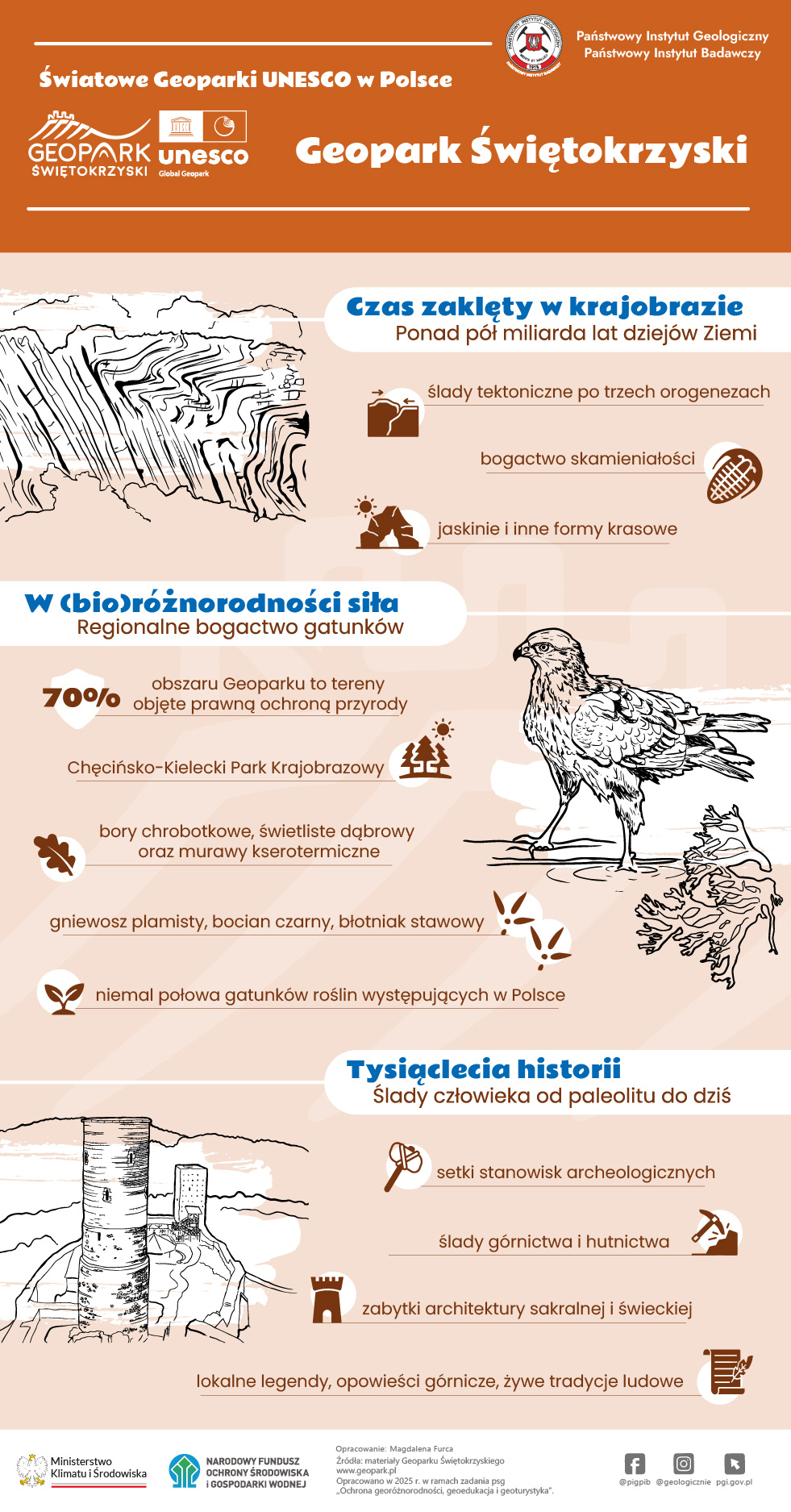 Światowy Geopark UNESCO Geopark Świętokrzyski to niezwykła geologia, bogata flora i fauna oraz ludzie, których obecność na tych ziemiach sięga niemal 60 tysięcy lat wstecz. Wśród licznych kamieniołomów i odsłonięć dokumentujących różne kadry z dziejów Ziemi przemykają zwierzęta, na żyznym podłożu chętnie rozwijają się rośliny, a w powietrzu unosi się duch dawnych wierzeń i wciąż żywej, lokalnej tradycji. Geopark od 2021 należy do Światowej Sieci Geoparków UNESCO.