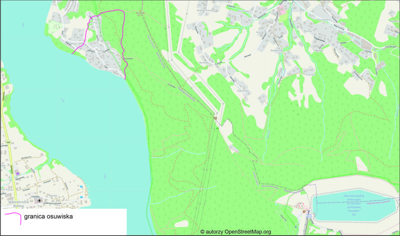Mapa z oznaczonymi granicami osuwiska. W prawym dolnym rogu zbiornik elektrowni pompowo-szczytowej na górze Żar. Źródło podkładu topograficznego: OpenStreetMap.org