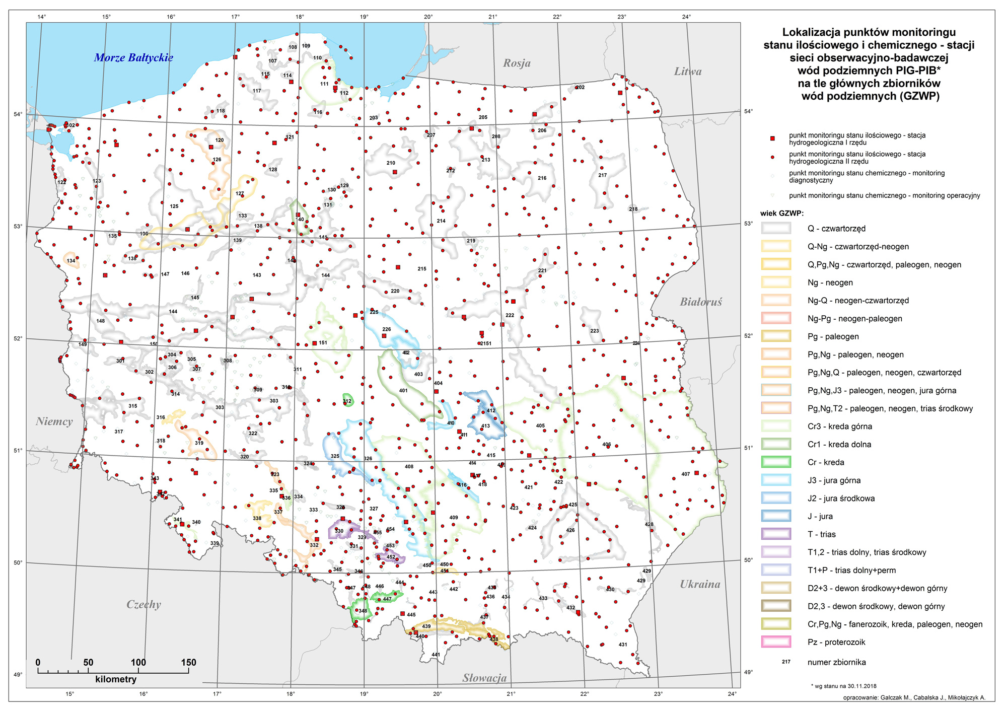 Ryc. 4. Lokalizacja punktów monitoringu stanu ilościowego i chemicznego – stacji sieci obserwacyjno-badawczej wód podziemnych PIG-PIB na tle głównych zbiorników wód podziemnych (GZWP).