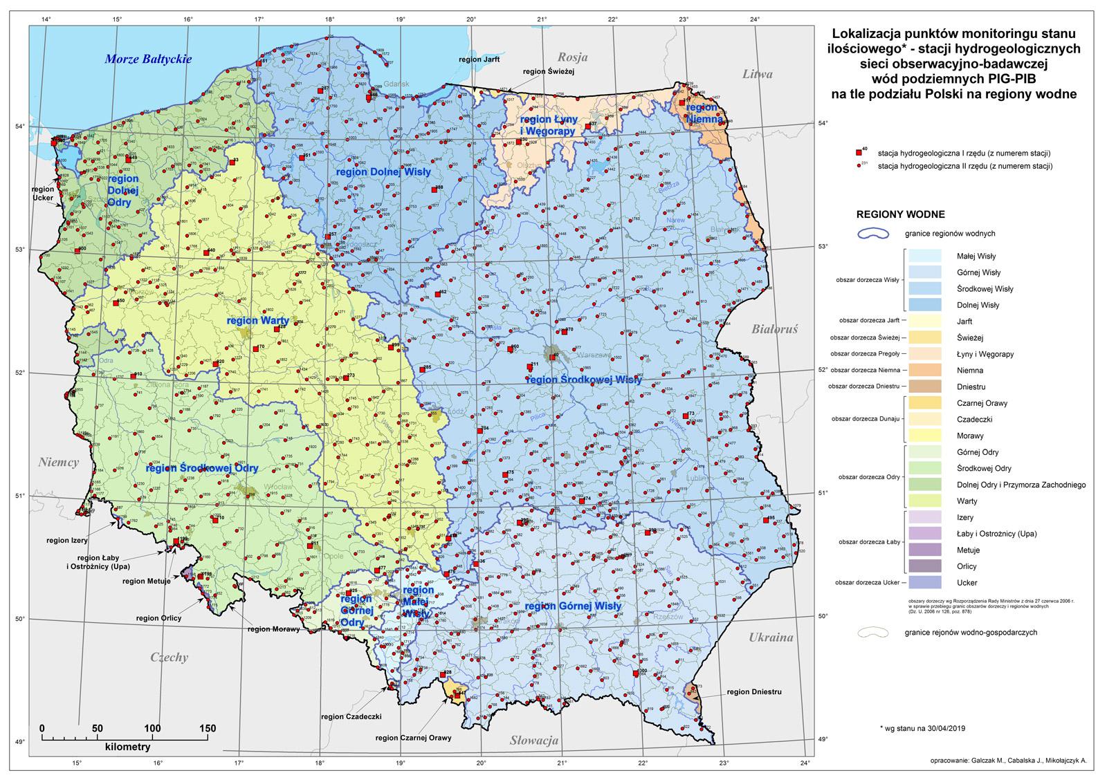 Ryc. 2. Lokalizacja punktów monitoringu stanu ilościowego – stacji hydrogeologicznych sieci obserwacyjno-badawczej wód podziemnych PIG-PIB na tle podziału Polski na regiony wodne.