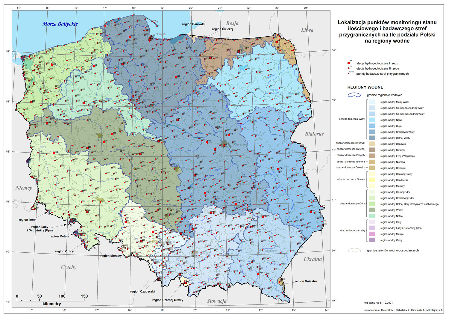 Ryc. 2. Lokalizacja punktów monitoringu stanu ilościowego – stacji hydrogeologicznych sieci obserwacyjno-badawczej wód podziemnych PIG-PIB na tle podziału Polski na regiony wodne.