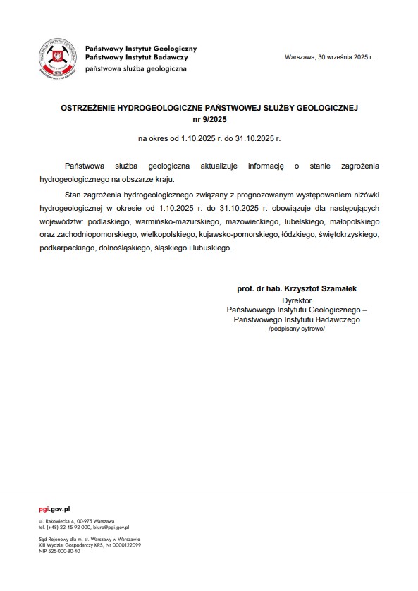 Przy założeniu wystąpienia w najbliższych tygodniach niekorzystnych warunków meteorologicznych (deficyt opadów atmosferycznych), niżówka hydrogeologiczna w prognozowanym okresie może występować na znacznych obszarach, głównie we wschodniej i centralnej części kraju. Zjawisko niżówki o zasięgu regionalnym prognozuje się w obrębie następujących województw: podlaskiego, warmińsko-mazurskiego, mazowieckiego, lubelskiego, wielkopolskiego, kujawsko-pomorskiego, łódzkiego, świętokrzyskiego oraz zachodniopomorskiego, pomorskiego, podkarpackiego i śląskiego.