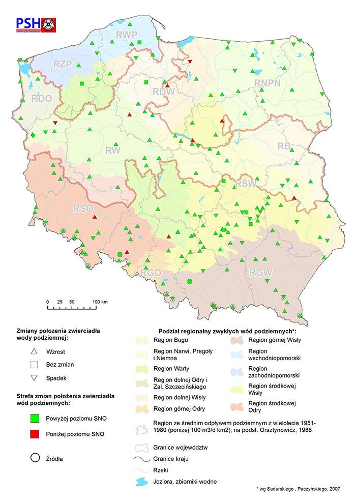 W omawianym okresie w większości analizowanych reprezentatywnych punktów obserwacyjnych Monitoringu Wód Podziemnych nastąpił wzrost poziomu wód podziemnych i wydajności źródeł w porównaniu do stanu udokumentowanego w pierwszym kwartale hydrologicznym br.